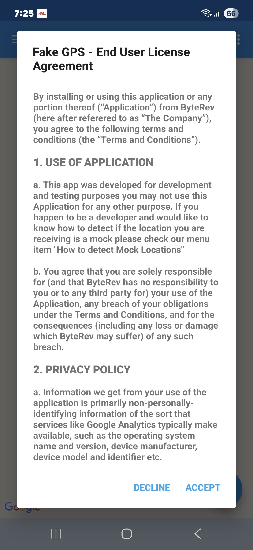 무료 안드로이드 위치 조작 Fake GPS 2. 약관 동의를 합니다.