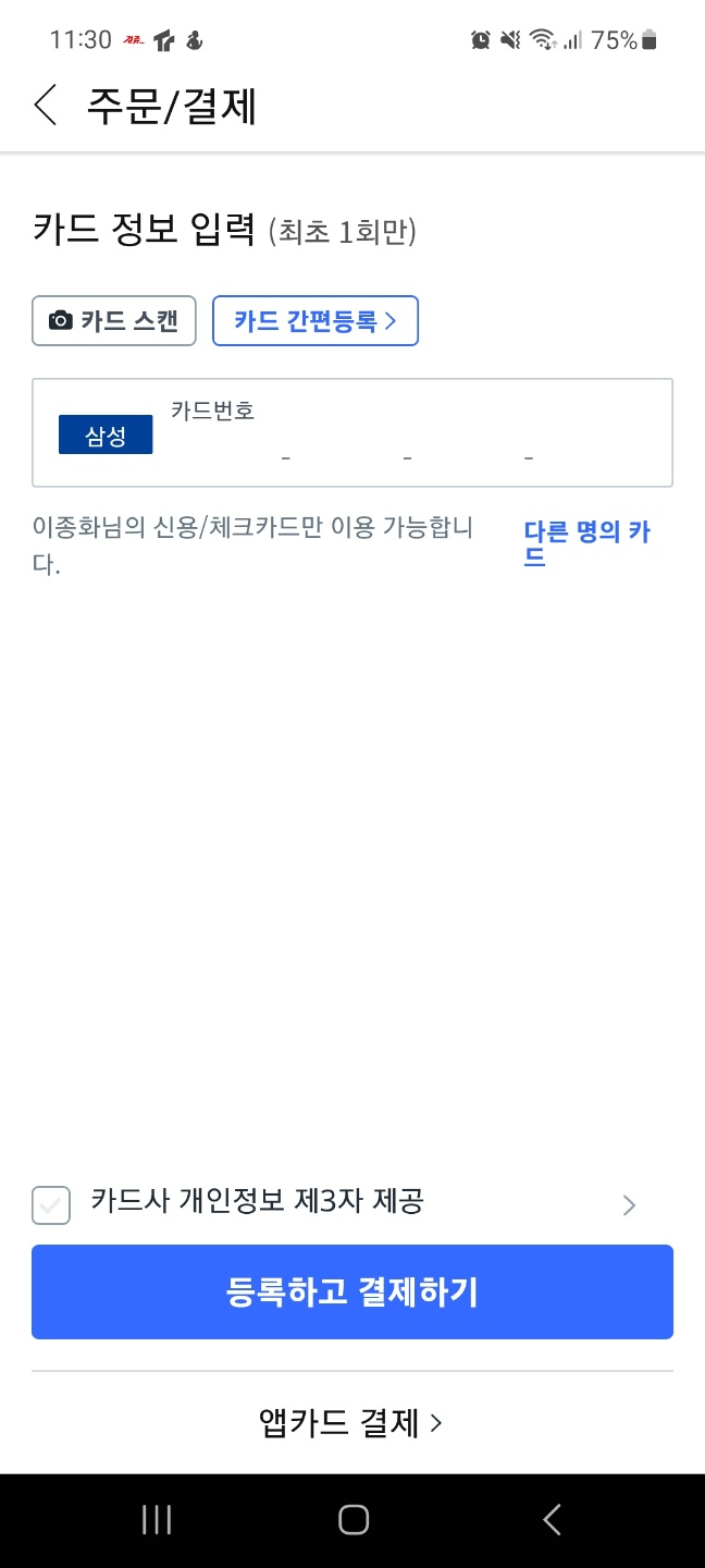 다른 명의 카드 선택해서 카드 정보를 입려갛거나 앱카드로 결제할 수 있습니다.